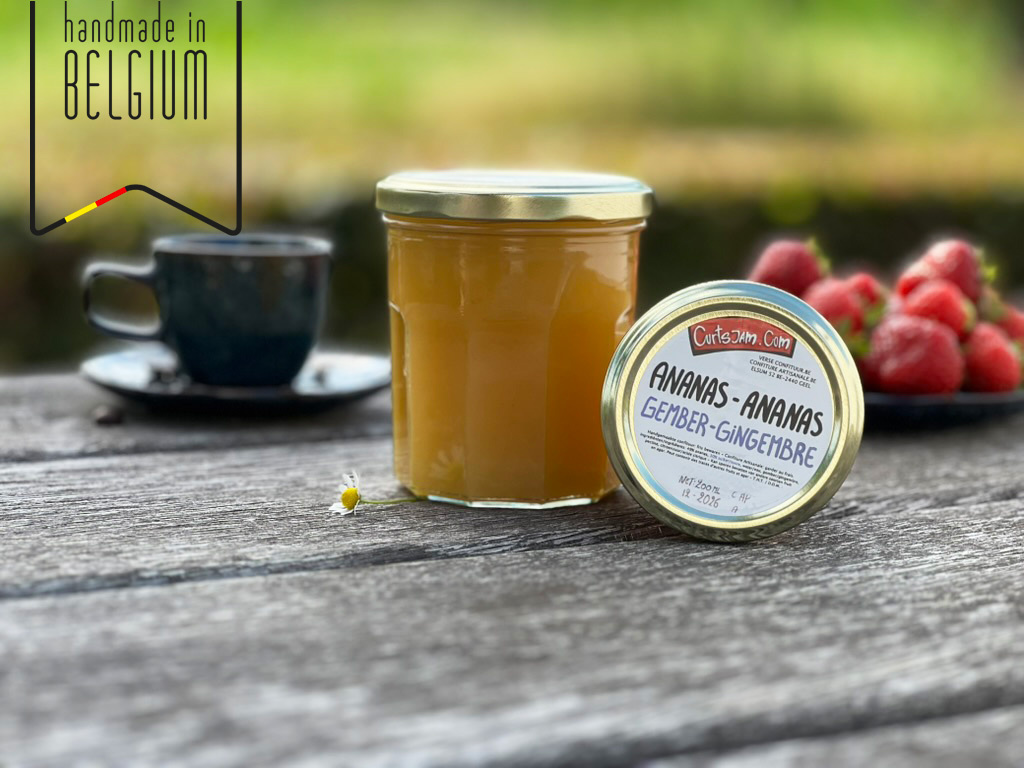 49 % Ananas, 30 % Zucker, Wasser, Ingwer, Pektin, Zitronensäure. Kann Spuren anderer Früchte und Agar enthalten.