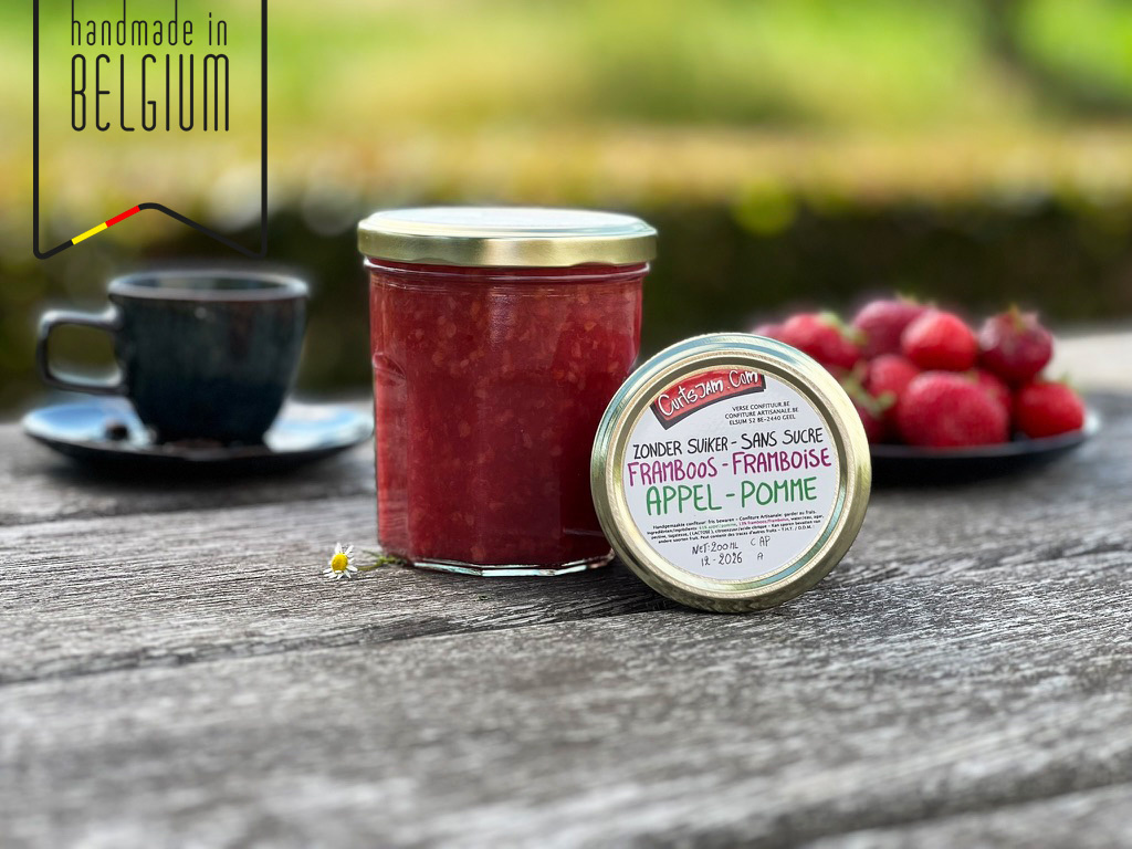 Apfel (61 %), Himbeere (13 %), Wasser, Agar, Pektin, Tagatesse (Laktose), Zitronensäure. Kann Spuren anderer Früchte enthalten.