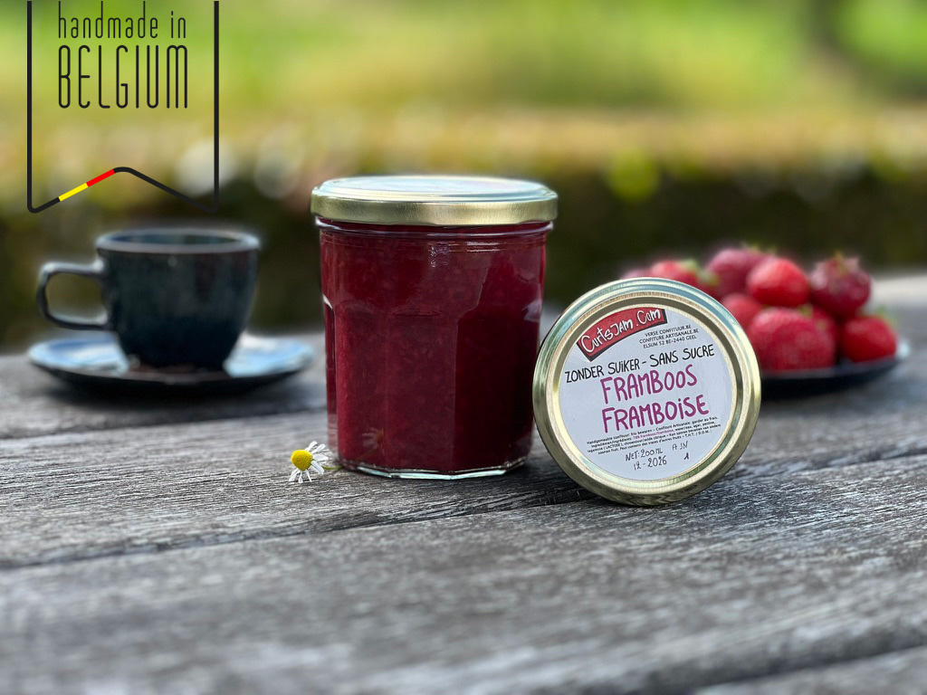 63 % Himbeeren, 18 % Apfel, Wasser, Agar, Pektin, Tagatesse (Laktose), Zitronensäure. Kann Spuren anderer Früchte enthalten.