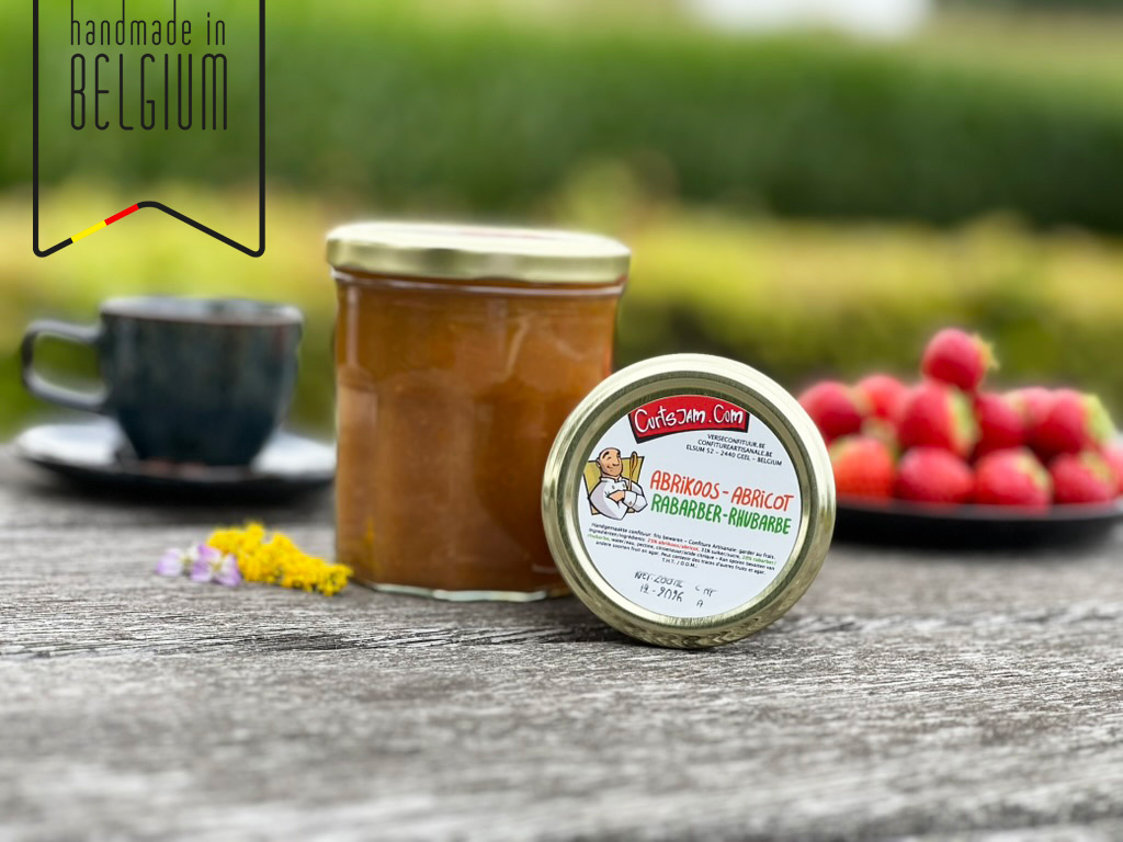 25% abrikoos, 28% rabarber, 31% suiker, water, pectine, citroenzuur. Kan sporen bevatten van andere soorten fruit en agar.